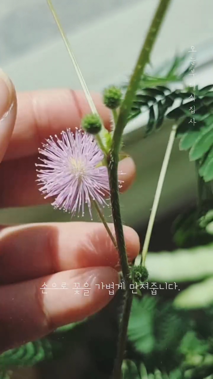 미모사 꽃이 피면 아주 약하게 꽃을 문질문질해줍니다.