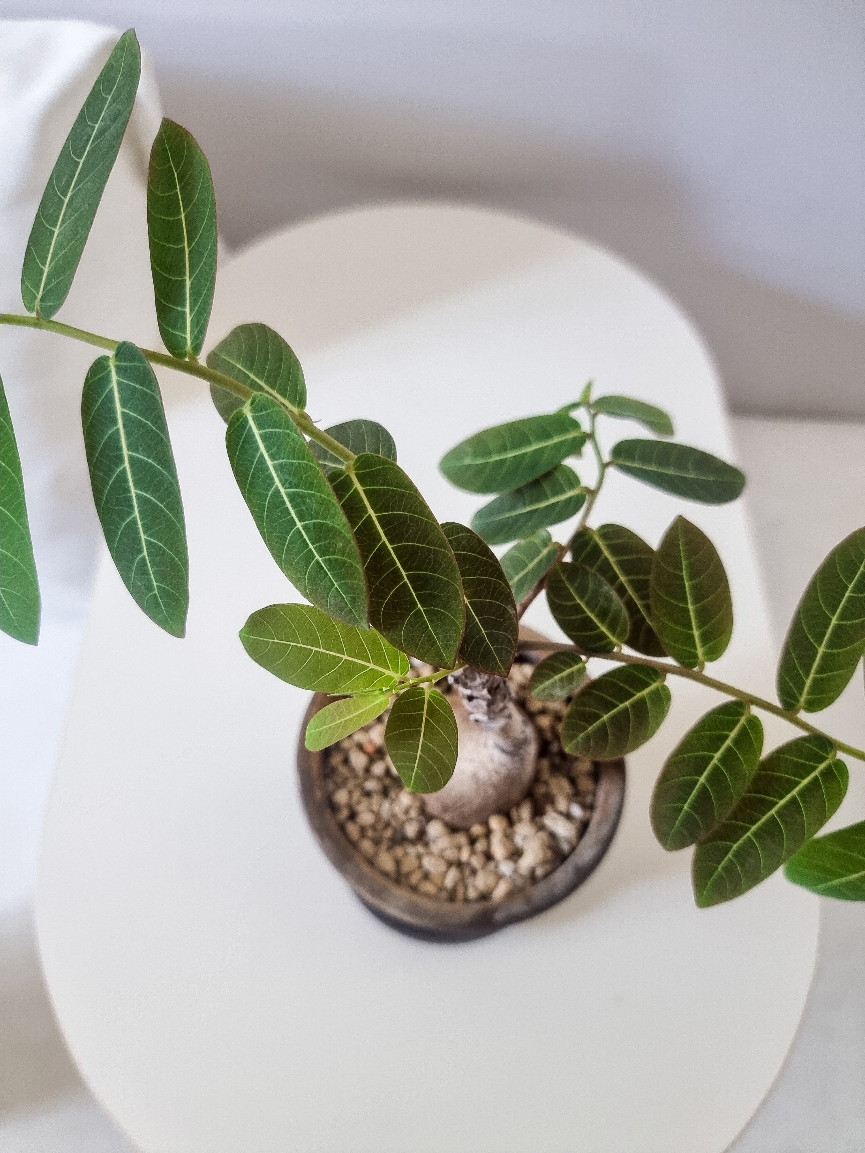 도톰한 줄기에서 뻗은 가지에 나란히 자리 잡은 짙은 초록잎.