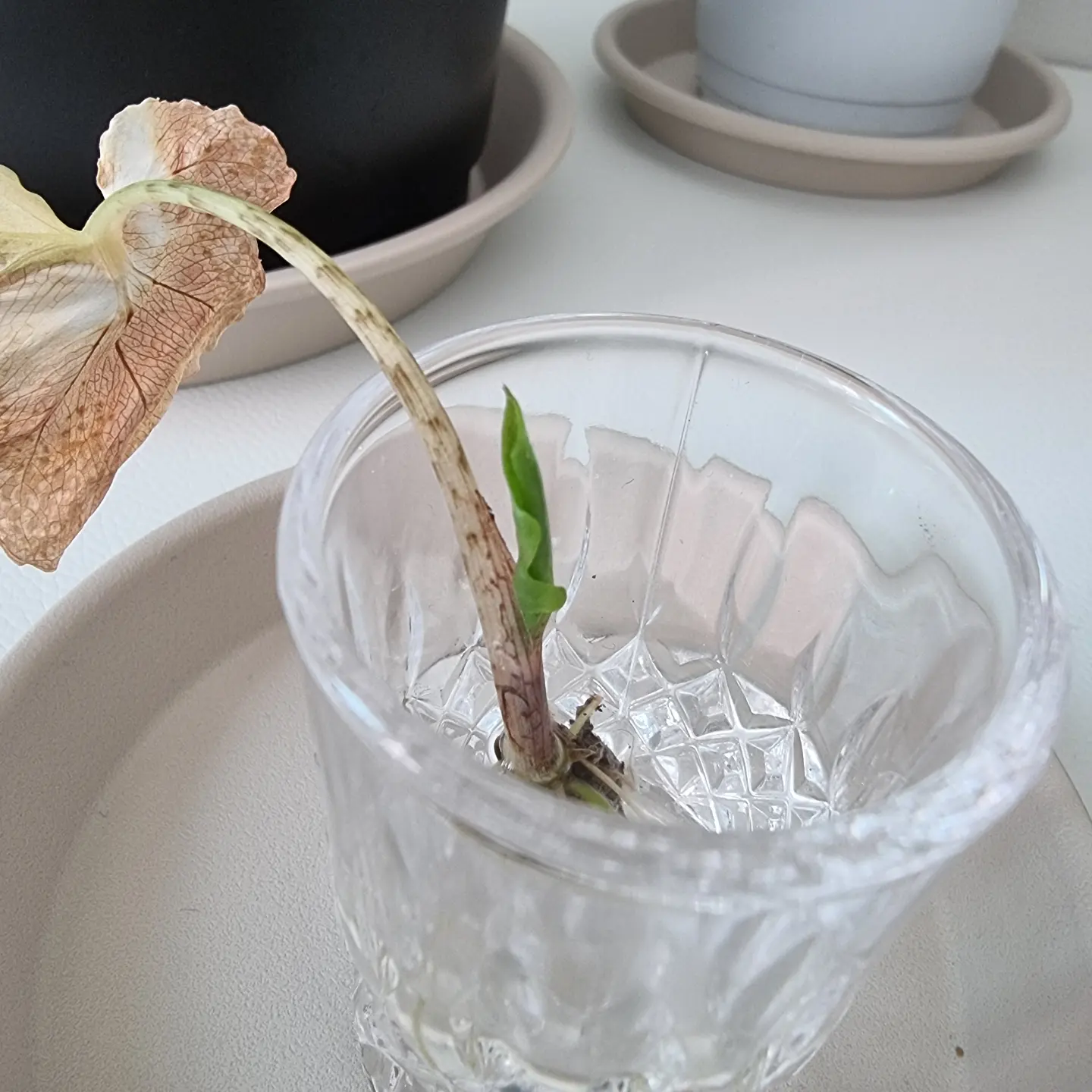 시들시들 하엽지던 알로카시아 유묘를 흙을 모두 털어내 뿌리를 씻고 정리한 후 소주컵에 물꽂이를 해 주었더니 빼꼼 새잎이 올라 왔어요. 시간은 좀 걸렸지만 포기 하지 않고 기다렸더니 희망을 보았어요.