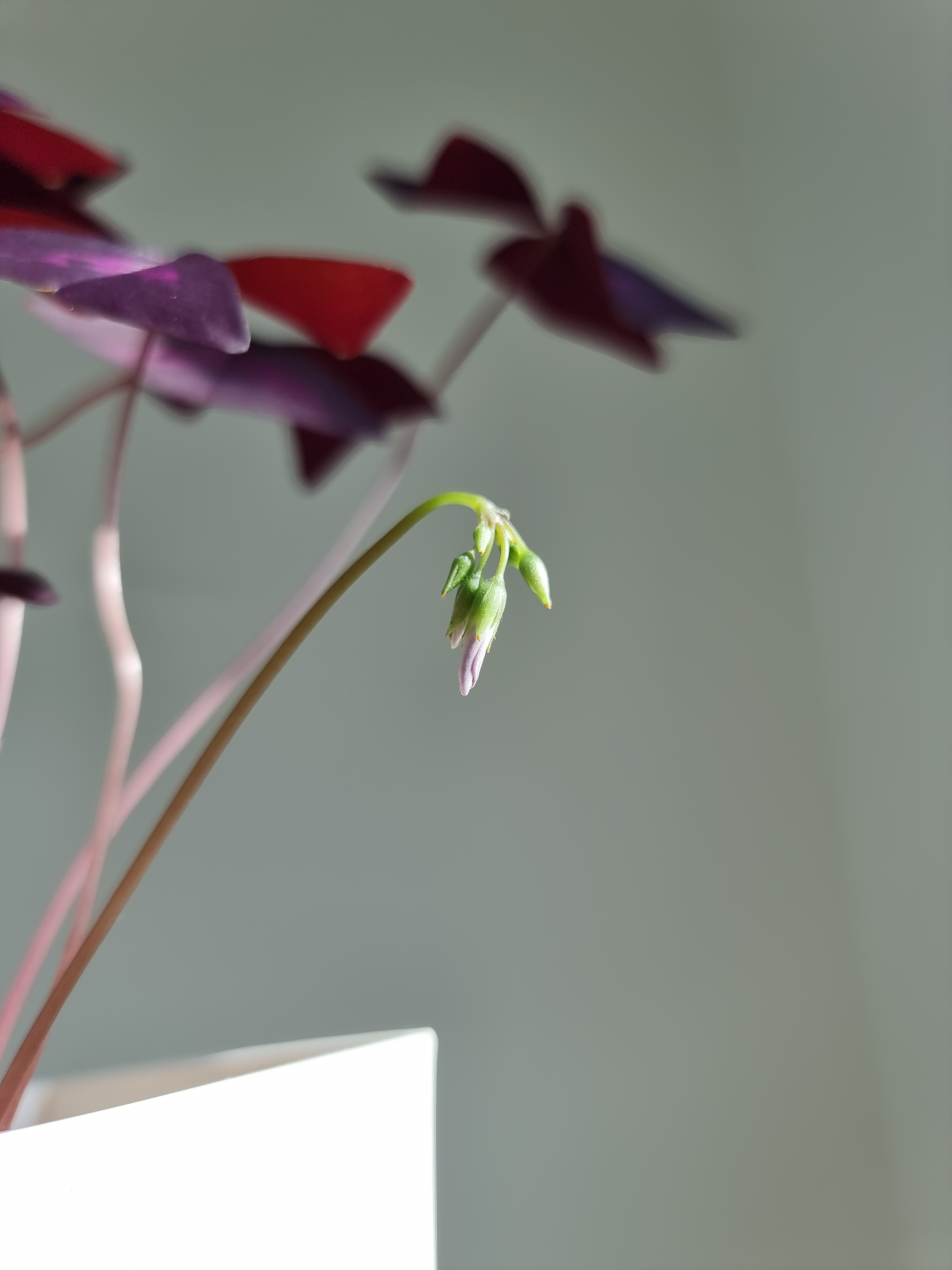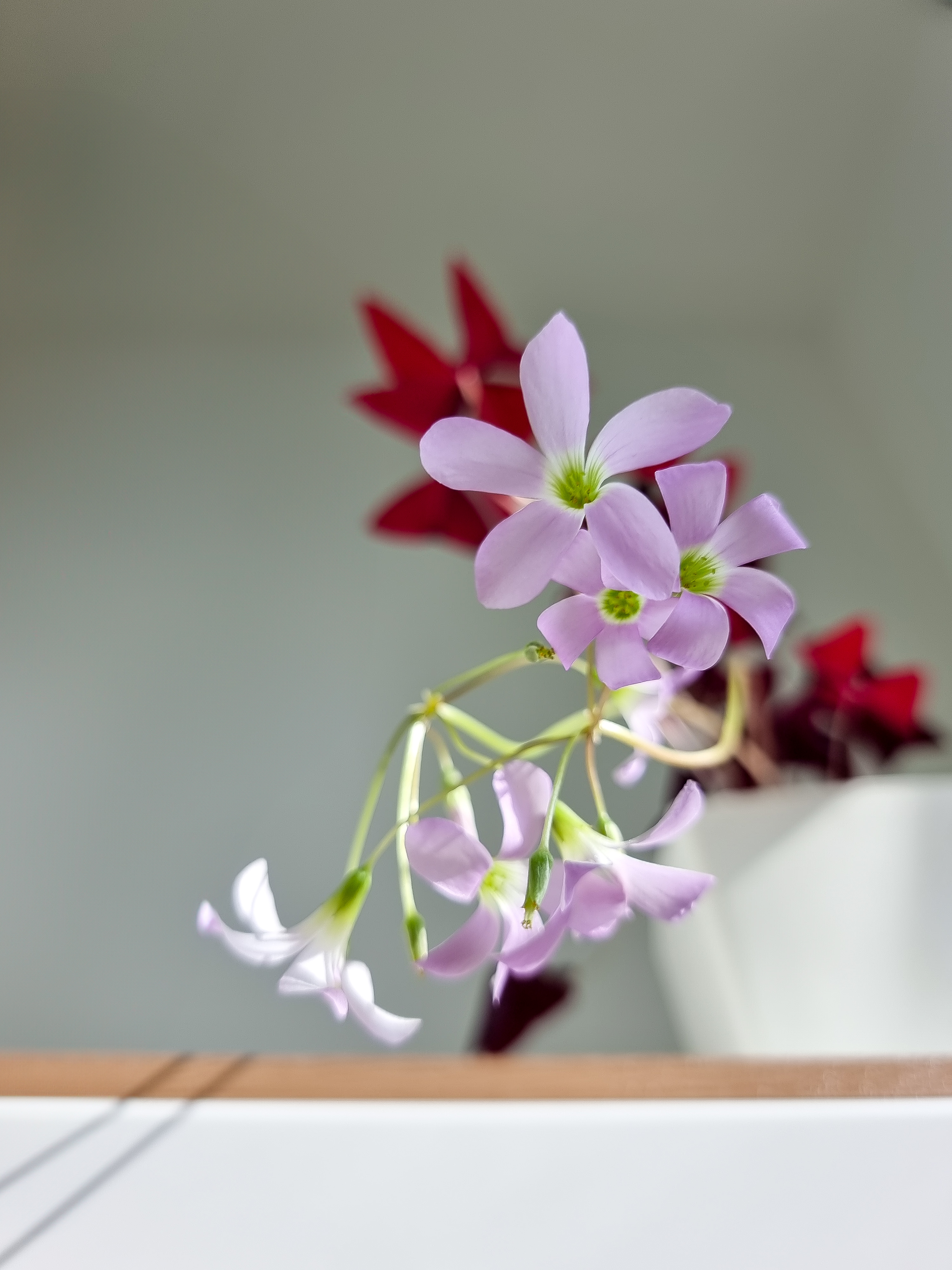 짙은 자주색 잎과 달리 옥살리스 자주 사랑초의 꽃은 여린 분홍빛을 띄는 예쁜 꽃입니다. 하나의 줄기가 길게 뻗어나오며 거기에 여러개의 꽃들이 피어납니다.