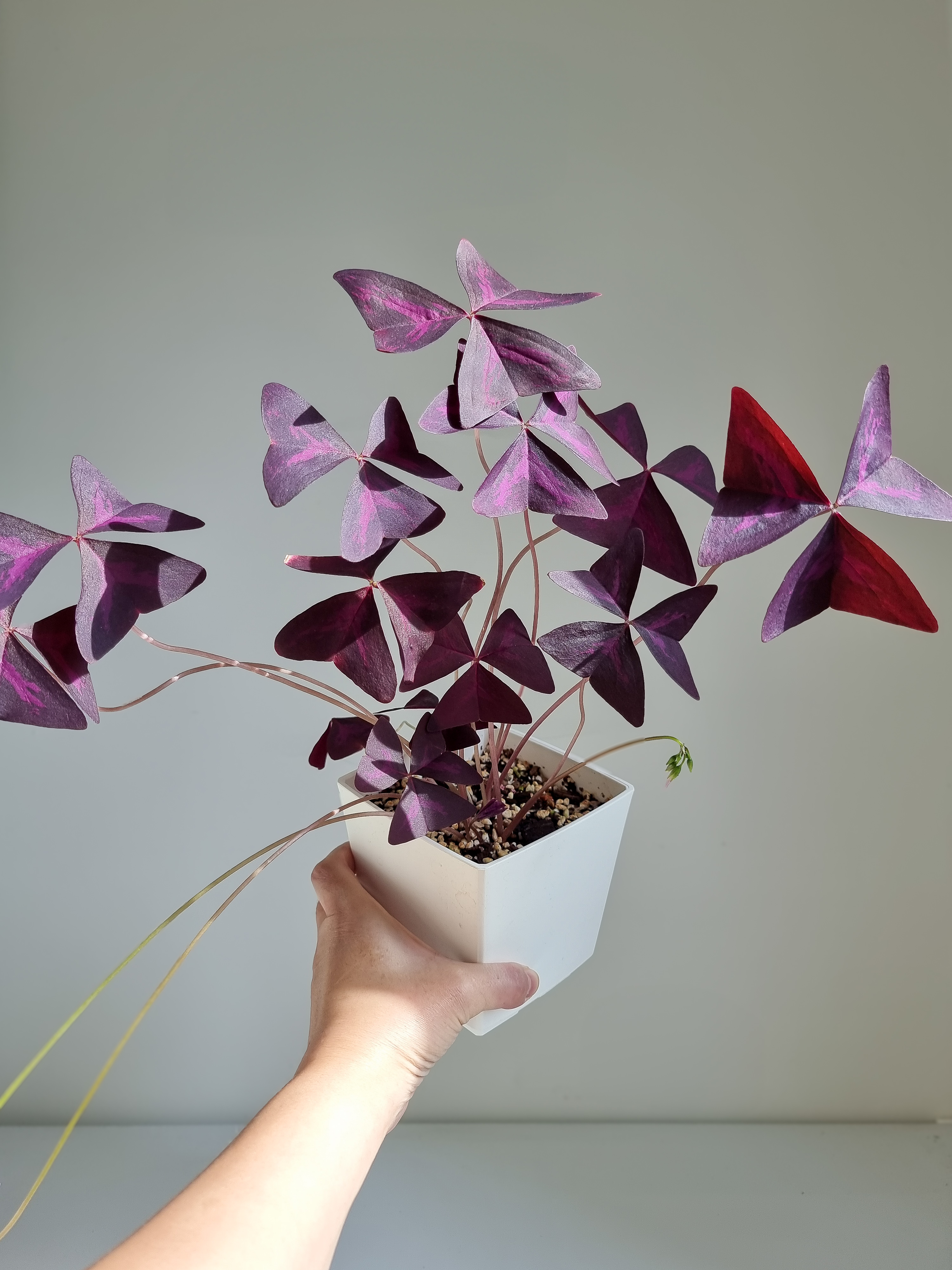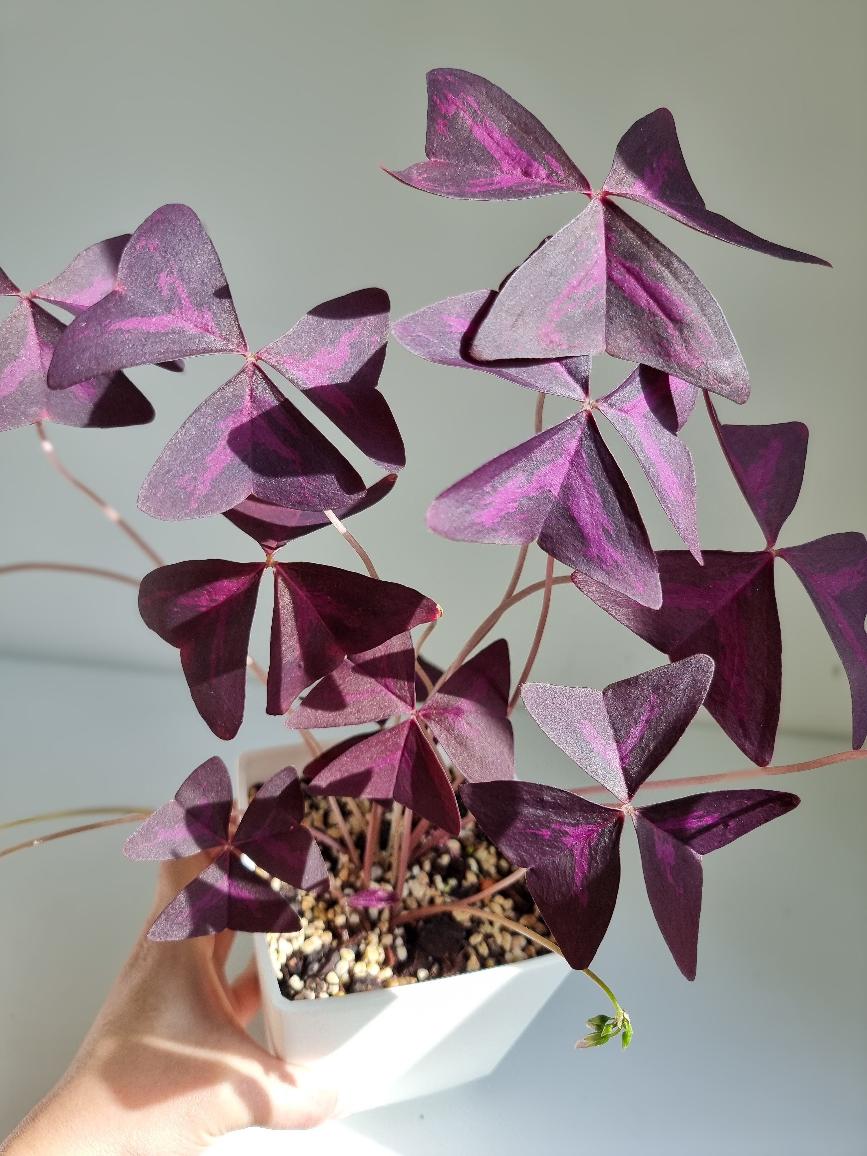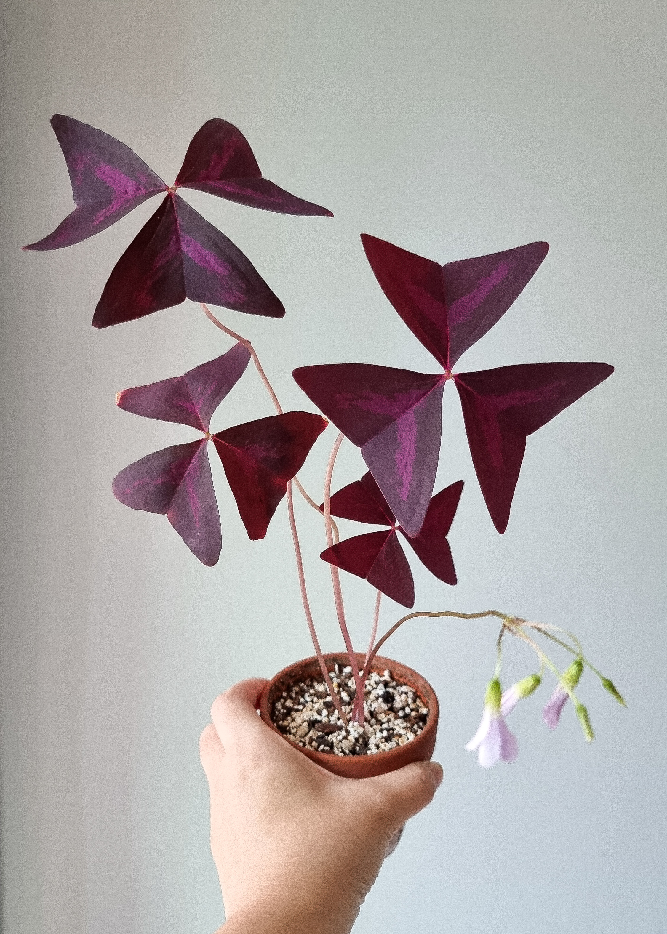 자줏빛 짙은 색감에 큼직한 잎이 매력적인 자주 사랑초는 아주 키우기 쉬운 사랑초 식물 중 하나인것 같아요.