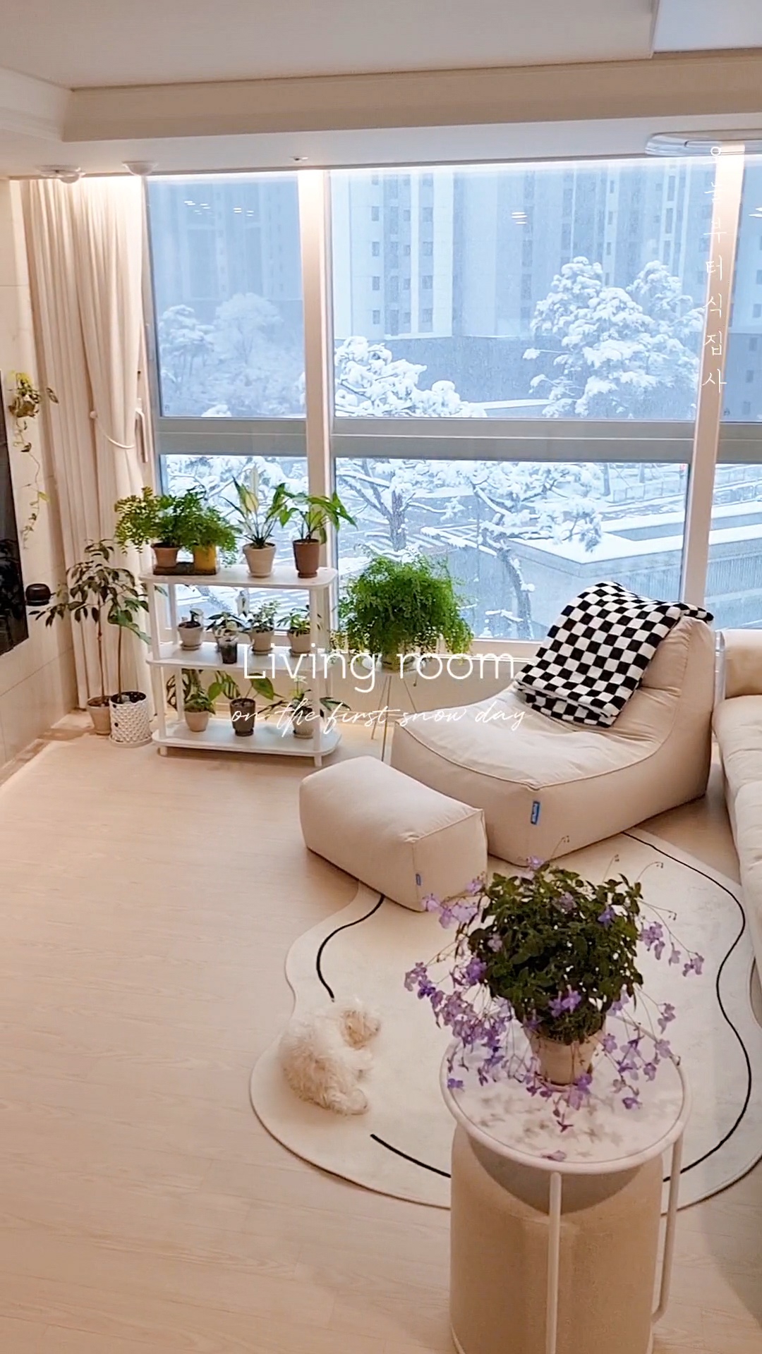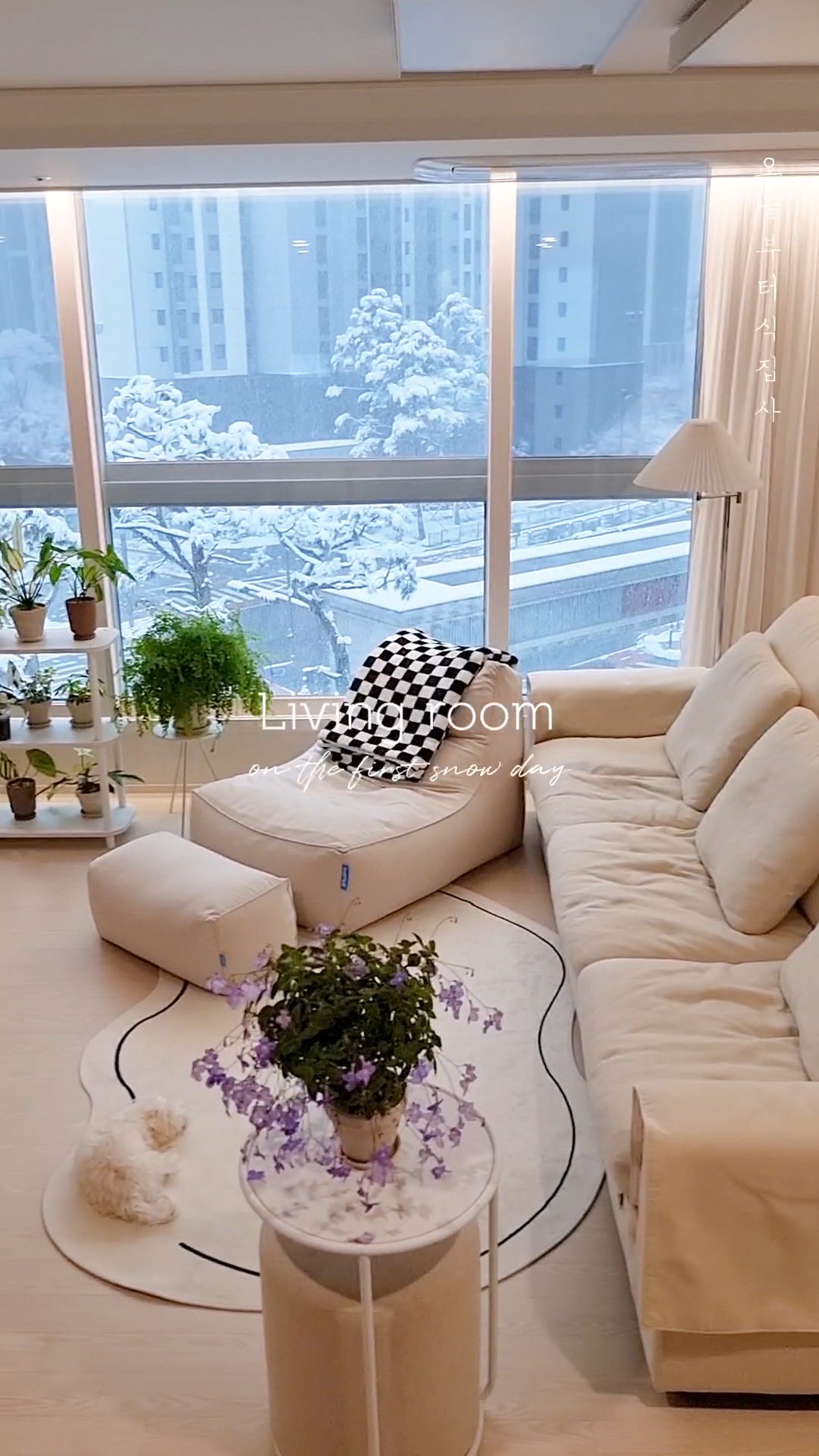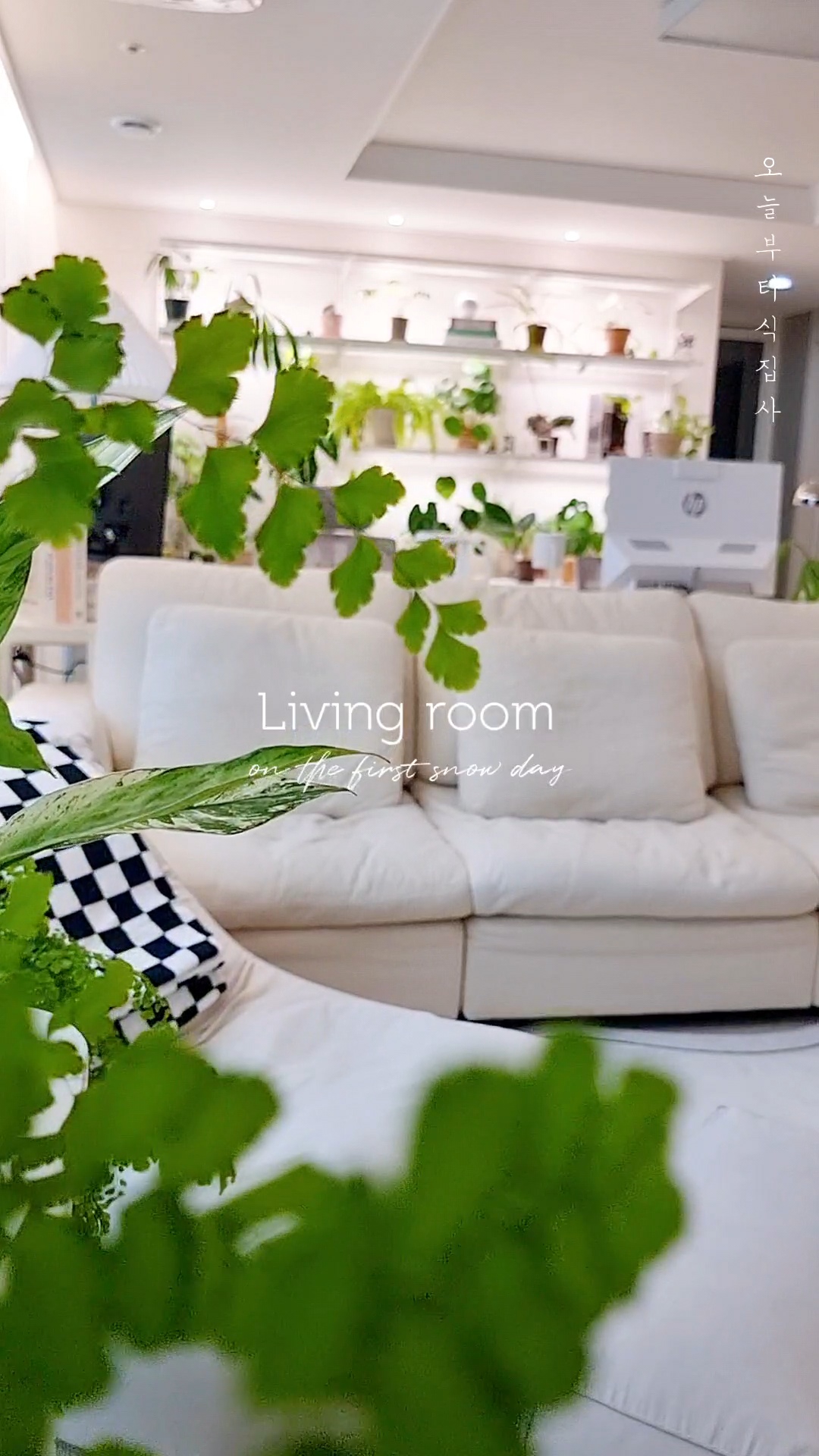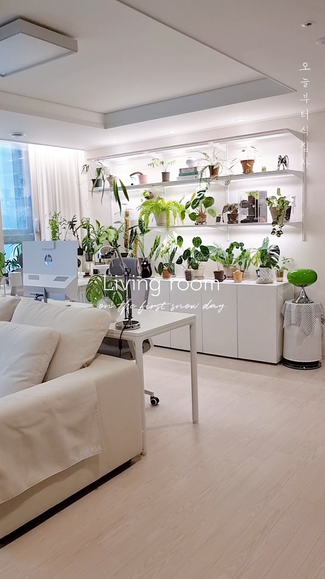 하얀 눈과 함께 초록의 식물들이 가득한 34평 저희집 거실의 모습을 사진으로, 영상으로 기록해 보았어요.